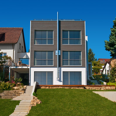 Das Gebäude grenzt direkt an das Nachbarhaus und schmiegt sich geradezu an den Hang und nutzt somit optimal die vorherrschenden Gegebenheiten aus. Raumhohe Fenster und großzügige Verglasungen schaffen einen direkten Bezug zur umliegenden Natur hergestellt: Licht und Durchsicht!