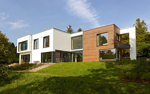 Ein gesundes und ökologisches Designhaus in einer kleinen englischen Stadt mit großem parkähnlichen Anwesen.