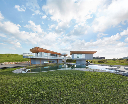 Zunächst beeindruckt die schiere Größe des Architekturensembles mit Haupthaus und Nebengebäude, mit ihren imposanten, weit ausladenden Holzdächern über filigranen Senkrechtstrukturen. Das soll ein Einfamilienhaus sein? Nun ja, es ist eines, aber ein ganz besonderes. Und das nicht nur wegen seiner baulichen Dimensionen.