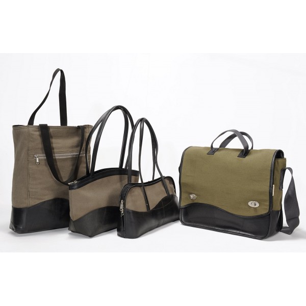So sind ganz unterschiedliche Materialien die Ausgangsbasis für stylische Upcycling-Produkte: Reifen und Schläuche, die von Armen aus Dehli gesammelt und dann an eine NGO-Recyclinganlage verkauft werden. Fallschirmsack-Stoff, der bei der indischen Armee erworben wird. Jeans-Etiketten und Sicherheitsgurte als Überbleibsel aus auslaufenden Kollektionen. Außerdem Plastikflaschen, also wiederverwertete PET-Flaschen, Zeitungspapier, das kunstvoll gefaltet und verwoben wird, ausgediente Schneidermaßbänder, geflochtene Bambushalme und gebrauchte Feuerwehrschläuche.