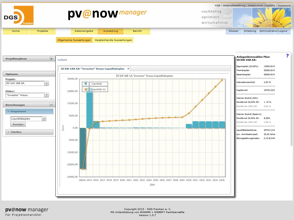 Innovativ und enorm vielfältig: pv@now rechnet neutral und unabhängig und ist die einzige Anwendung auf dem Markt, die Volleinspeisung, Eigenstromnutzung, Stromlieferung, PV-Miete, Direkvermarktung und vieles mehr rechnen kann. Zudem können Sie mit pv@now alle nur denkbaren Änderungen ihres PV-Projekts abbilden, von der Erweiterung durch Stromspeicher bis hin zum Wechsel des Betreibermodells. Der Clou: Auch steuerliche Aspekte werden in den Berechnungen berücksichtigt. Alle beteiligten Akteure wie Investor, Betreiber, Gebäudeeigentümer und Stromverbraucher werden separat dargestellt. Alle Planungsvarianten können miteinander verglichen, die Ergebnisse anschaulich in Graphen und Tabellen visualisiert werden.