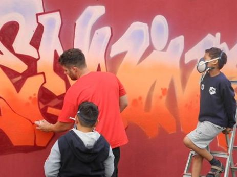 Der Workshop begann mit einer theoretischen Einführung in die Materie des Graffitis. Der hauptberufliche Diplom-Sozialpädagoge Maximilian Frank erklärte woher Graffiti kommt, was rechtlich erlaubt ist und wie das Sprayen gelingt. Danach gestalteten die Jugendlichen gemeinsam mit dem Künstler ein Motiv für den Eingangsbereich und setzten es nach individuellen Übungen auf Leinwänden auch gleich in die Tat um.