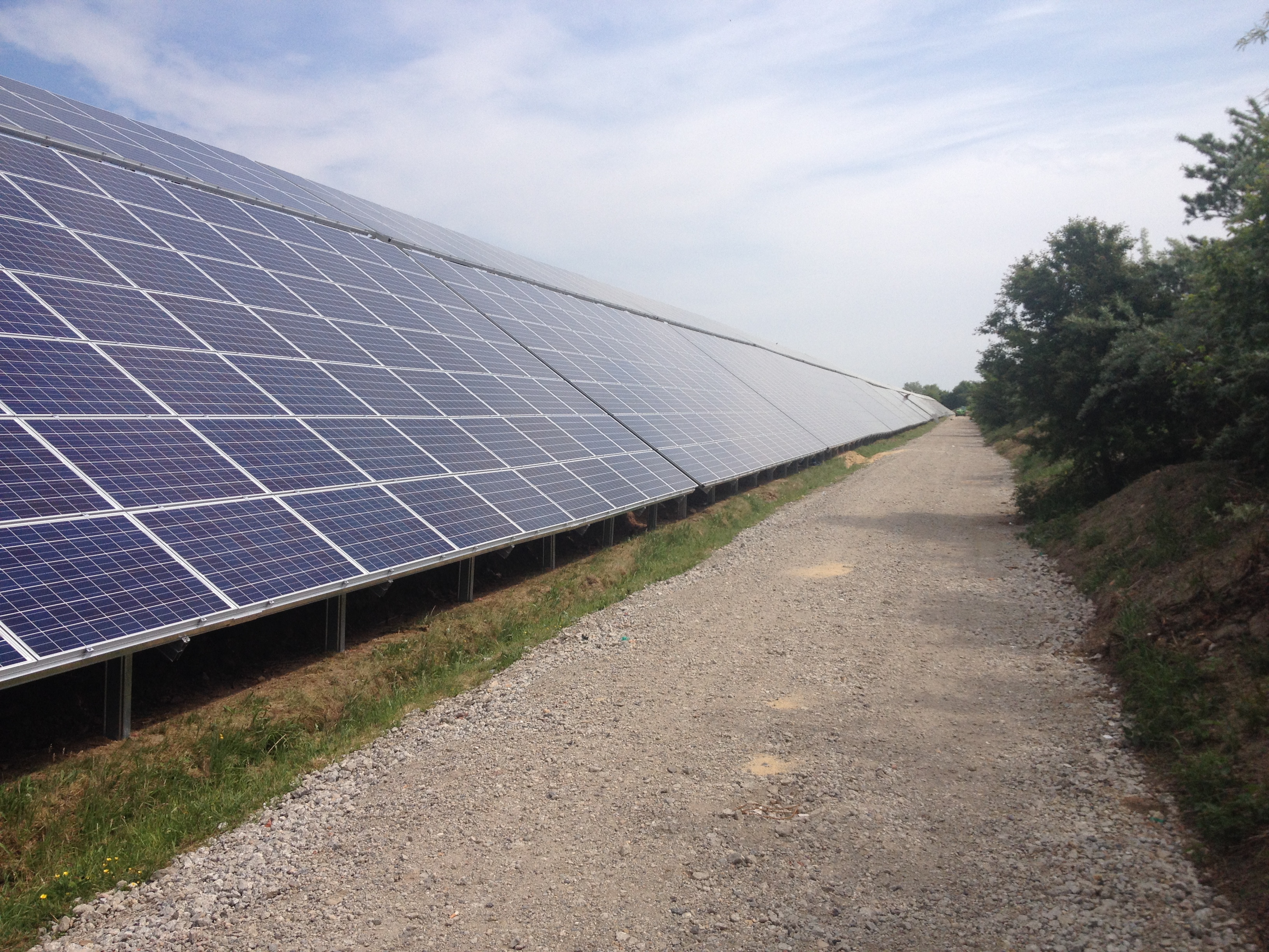 Um dem Montagesystem für die Photovoltaikanlage bei diesem schwierigen Gelände Standhaftigkeit zu verleihen, setzt die Mounting Systems ein speziell auf die besonderen Anforderungen angepasstes Gestellsystem ein. Auf der Basis des bewährten Sigma I XL aus Aluminium wurden die Pfosten an das Gelände angepasst und Sparren über die komplette Höhe der Böschung verwendet. Das besonders flexible System erlaubte die genaue Montage vor Ort Dank projektspezifischer Bohrungen. Mittels des anpassungsfähigen Systems konnten große Tischkonfigurationen mit Modulen in Quermontage über eine Gesamtlänge von 600 Metern umgesetzt werden.