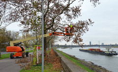 Für Kommunen bietet die Bewertung von Stadtbäumen durch die GALK eine wichtige Vorinformation insbesondere für die Neupflanzung, denn bei der Bonitierung der Straßenbäume in ihrer Eignung für die Städte wird auch der Pflegeaufwand bewertet. Dieckmann: „Seit einigen Jahren gibt es auch bei uns zunehmende Probleme mit Massaria-Befall bei Platanen, weshalb wir die Kontrollen verstärkt haben. Wir führen die meisten Kontrollen mit eigenen Kräften durch, bei Bedarf schreiben wir aber auch aus und nehmen externe Fachunternehmen unter Vertrag.“ Steven van Santen ist ausgebildet als European Tree Worker und koordiniert für BSI die Baumkontrollen in Düsseldorf: „Der Schadpilz tritt vor allem in zu dichten Baumkronen auf. Deshalb lichten wir die Bäume bei Bedarf aus.“ Die Kombination von Baumkontrolle und sofortigen Schnittmaßnahmen hat sich bewährt. Typisch für den Befall mit Massaria ist das Schadbild auf der Oberseite der Äste. Da man dies von unten nicht erkennen kann, erfolgt die Massaria-Kontrolle mit einem Hubsteiger in der Krone.