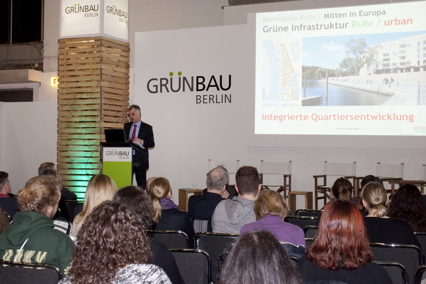 Die Fachveranstaltung mit vier Kurzvorträgen und einer Podiumsdiskussion wurde von der Messe Berlin in Kooperation mit dem Patzer Verlag und der Stiftung DIE GRÜNE STADT veranstaltet. Peter Menke, Vorstand der Stiftung, begrüßte die rund 100 Teilnehmer und führte in das Tagungsthema ein: „Es ist kein Zufall, dass wir hier auf einer Baumesse einen Schwerpunkt auf Grünthemen legen. Die großen Fragen zur zukünftigen Stadtentwicklung befassen sich immer wieder mit dem richtigen Verhältnis von Innenverdichtung und Freiraumsicherung.“ Als Motor für die Debatte nannte er den anhaltenden Trend zur Urbanisierung und zusätzliche Einflüsse infolge des Klimawandels und starker demographischer Veränderungen. Der öffentliche Raum habe erhebliche Bedeutung für die Lebensqualität und die Gesundheit der Menschen, müsse jedoch als potenzieller Baugrund erheblichen Interessenkonflikten standhalten. „Wie wollen wir zukünftig leben? und Was müssen wir heute tun, um den Umbau der Städte frühzeitig in die richtigen Bahnen zu lenken?“ fragte Menke die Referenten und Teilnehmer zum Einstieg in die Forumsveranstaltung.