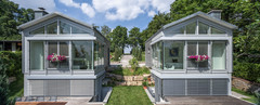 Einmalig wohngesunde Architektur, zweifach realisiert: Diese beiden Baufritz-Häuser teilen sich nicht nur das Grundstück, sondern auch das Konzept. So konnten die Hausherren, zwei befreundete Paare ohne Kinder, Kosten sparen ohne auf etwas zu verzichten. Durch die geschickte Aufteilung holen die unterkellerten Holzfertighäuser das Maximum aus jedem der insgesamt 117 Quadratmeter heraus. Zudem wurde jede Passivhaus-Hälfte mit einem Satteldach geplant. In den darunter liegenden Schlafräumen warten hohe Decken sowie ein herrlicher Blick auf die Landschaft. Außerdem gehört zu jedem Designerhaus eine eigene Terrasse, auf der die Parteien den Tag unabhängig voneinander ausklingen lassen können.
