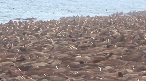 Es ist bereits das 6. Mal in den letzten acht Jahren, dass die Walrosse in der Tschuktschen-See sich mangels Eisschollen ans Ufer schleppen. Experten des US-Regierungsinstituts USGS (United States Geological Survey) vermuten, dass die Tiere auf der Suche nach Packeis an dem Küstenstrich gestrandet sind. Erstmals sei die Versammlung am 27.September aus der Luft beobachtet worden.