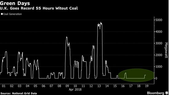 Green days: England kommt 55 Stunden ohne Kohle aus. Zum ersten Mal konnte Großbritannien jetzt für mehr als zwei ganze Tage auf die Energie aus Kohlekraftwerken verzichten. Das meldet der Wirtschaftsdienst von Bloomberg.