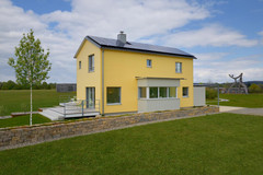 Und nun bekam dieses klimaschützende PlanMit Haus in Erkheim einen neuen Trend-Look. Aus dem modernen Designhaus in schwarz wurde das gemütliche Schwedenhaus mit einer gelblichen Credo-Holzverschalung.