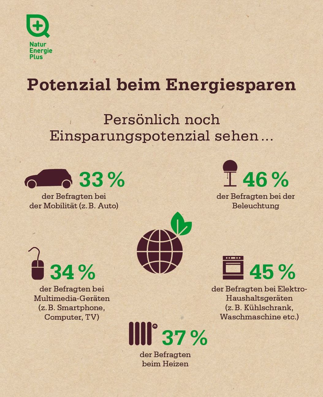 Laut einer von NaturEnergiePlus beauftragten repräsentativen Umfrage durch forsa wissen die Deutschen, wie und wo sie im Alltag am besten Energie sparen können. Einsparpotenziale sieht knapp die Hälfte der Befragten bei der Beleuchtung (46 Prozent) und bei Elektro-Haushaltgeräten wie dem Kühlschrank oder der Waschmaschine (45 Prozent). Darauf folgen die Bereiche Heizen (37 Prozent), Multimedia (34 Prozent) und Mobilität (33 Prozent). Rund ein Drittel (32 Prozent) nimmt aber an, dass Energiesparmaßnahmen die Lebensqualität mindern. Und mehr als ein Drittel glaubt, sich die Kosten für Gebäudedämmung (42 Prozent) beziehungsweise für die Anschaffung energiesparender Geräte (34 Prozent) nicht leisten zu können.