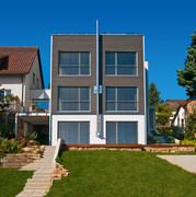 Das Gebäude grenzt direkt an das Nachbarhaus und schmiegt sich geradezu an den Hang und nutzt somit optimal die vorherrschenden Gegebenheiten aus. Raumhohe Fenster und großzügige Verglasungen schaffen einen direkten Bezug zur umliegenden Natur hergestellt: Licht und Durchsicht!