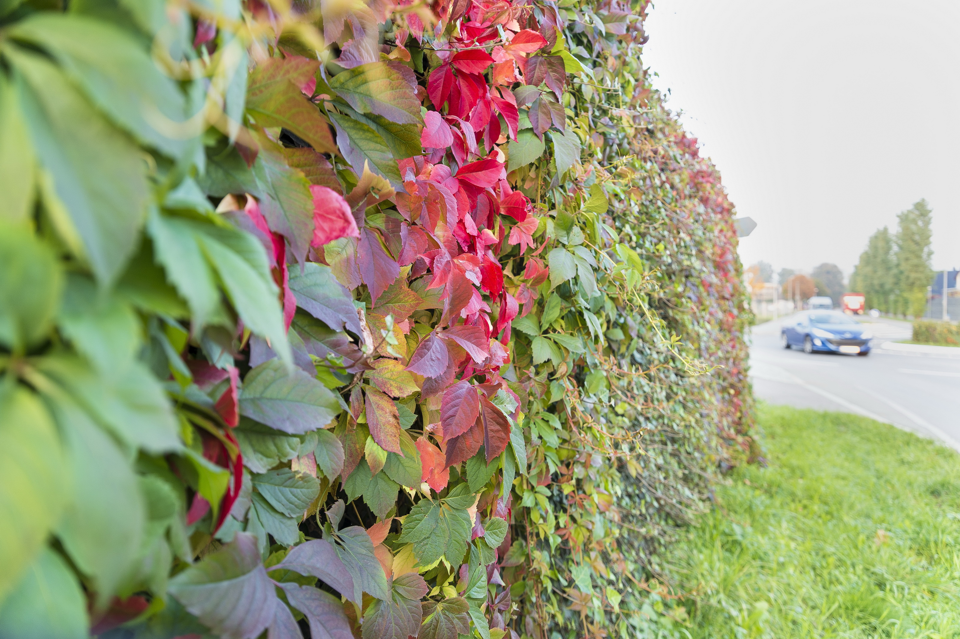 Für das Lärmschutzsystem haben sich verschiedene Pflanzenarten bewährt. Angeboten werden heute Vegetationsmatten – die aus Kokosfasern bestehen – mit Klettergewächsen wie beispielsweise Efeu oder Wildem Wein sowie mit blühenden Stauden wie Geranium oder Bergenia. Je nach Vorliebe kann man sich für eine immergrüne Sorte oder eine bunte Mischung entscheiden. Dank der vorkultivierten Matten entfällt die lange Anwachszeit, was auch die Pflegekosten zu Beginn erheblich reduziert. Bereits zum Montagezeitpunkt sind die Wände etwa zur Hälfte mit Vegetation bedeckt. In der Wachstumsperiode sind sie dann innerhalb weniger Wochen komplett begrünt. Damit der Pflegeaufwand auch zukünftig möglichst gering bleibt, sorgt eine integrierte Tröpfchen-Bewässerung bei 'Helix Compacta' immer für die ausreichende Versorgung mit Feuchtigkeit und Dünger. Im Idealfall wird das Regenwasser von den Dächern der umliegenden Häuser in einer Zisterne gesammelt und für die Bewässerung genutzt.