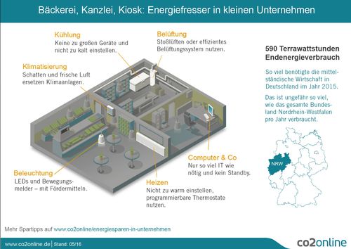 Die <linkwww.co2online.de/sparmoeglichkeiten-unternehmen> Infografik „Energiefresser in kleinen Unternehmen“ zeigt unter sechs Möglichkeiten, wie branchenübergreifend viele Unternehmen Energie sparen können. Folgende sechs Tipps ergänzen die Infografik: