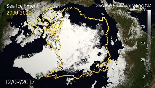 Das Meereis der Arktis gilt als kritisches Element im Klimageschehen und als Frühwarnsystem für die globale Erwärmung. Aus diesem Grund ist das Septemberminimum ein wichtiger Indikator für Klimaänderungen. Wissenschaftler des Alfred-Wegener-Instituts sowie der Universitäten Bremen und Hamburg beobachten das Abschmelzen des arktischen Eisschilds. Sie bestimmen die jeweils aktuelle Meereisfläche wird mit Hilfe von Satelliten.