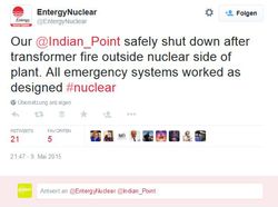 Entwarnung per Twitter: Der US-Atomkraftbetreiber Entergy Nuclear informierte kurz vor 2 Uhr in der Nacht, alle Sicherheitssysteme arbeiteten planmäßig. Gefahr gebannt.