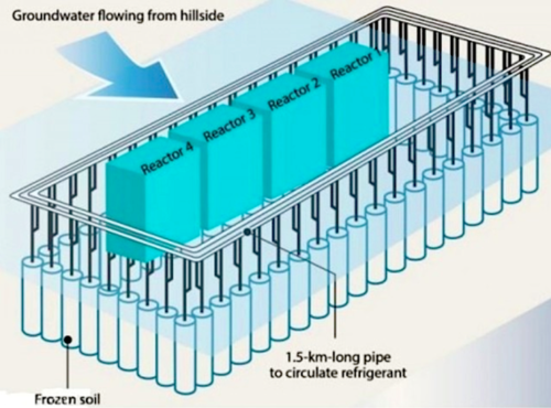 Zur Kühlung der zerstörten Reaktoren des Kernkraftwerks Fukushima in Japan wird laufend Wasser hineingepumpt. Gleichzeitig sickert Grundwasser in die Reaktorkeller und vermischt sich dort mit dem verstrahlten Kühlwasser. Millionen Liter radioaktiv verseuchtes Wasser fließen so täglich in den Pazifik. Dies will der Betreiber TEPCO jetzt stoppen und startete am Montag mit dem Bau einer sogenannten „Icewall“. Damit soll der Boden gefroren werden und somit kein Wasser mehr durchlassen. Gleichzeitig soll verhindert werden, dass Grundwasser sich mit dem Kühlwasser vermischt.