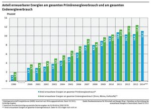 „In den letzten Jahren zeichnete sich bei den erneuerbaren Energien ein starker Aufwärtstrend ab. Der Anteil am gesamten Primärenergieverbrauch stieg von 2,9 Prozent im Jahr 2000 auf 11,1 Prozent im Jahr 2014. Bezogen auf den gesamten Endenergieverbrauch hatten die erneuerbaren Energien im Jahr 2013 einen Anteil von 12,4 Prozent, er hat sich damit im Vergleich zum Jahr 2000 mehr als verdreifacht.“ ( Quelle: Umweltbundesamt)