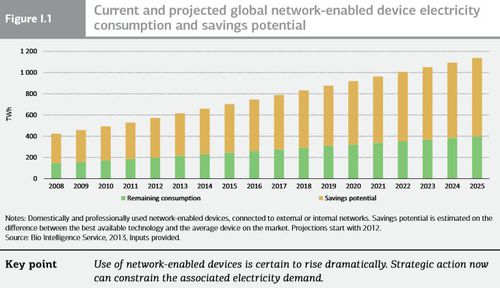 Mit der zunehmenden Zahl der Geräte klettert auch der Energiebedarf. 2008 lag der bei bereits 420 Terawatt-Stunden pro Jahr. Das entspreche dem Strombedarf Frankreichs, so die Studie. Im Vorjahr kletterte er schon auf 616 Terawatt-Stunden, das entsprecht dem Stromverbrauch Kanadas. Bis 2025 soll er, so schätzt die Beratungsagentur Bio Intelligence Service, auf 1.140 Terawatt-Stunden oder den Bedarf Kanadas plus Deutschlands klettern.