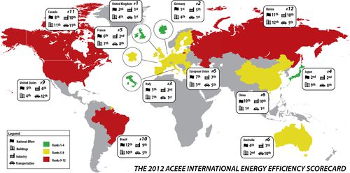 Weltmeister der Energie-Effizienz: Großbritannien siegt knapp, Deutschland und Italien gehen mit geringem Abstand durchs Ziel. Das Ranking des American Council for an Energy-Efficient Economy (ACEEE) prüfte 12 Länder auf deren Umgang mit Energie. Die USA landen abgeschlagen auf Platz 9. Schlusslicht ist Russland.