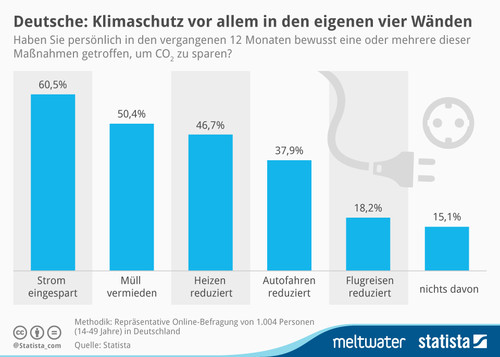 Rund 60,5 Prozent gaben an, Strom eingespart zu haben, 50,4 Prozent sagten, sie hätten Müll vermieden. Das Heizen reduzierten der eignen Aussage zufolge 46,7 Prozent, 37,9 Prozent verzichten zumindest etwas auf das Autofahren. 18,2 Prozent behaupten gar, aus CO2-Spargründen Flugreisen reduziert zu haben. Nur 15,1 Prozent sagten, sie hätten keine dieser Maßnahmen ergriffen.