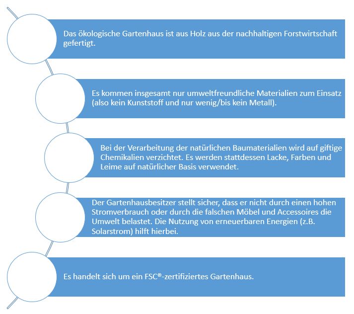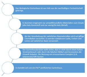 Auf Wikipedia wird Nachhaltigkeit unter anderem so definiert, dass durch den Hersteller und das Produkt kein Raubbau an den Ressourcen betrieben wird. Die natürliche Regenerationsfähigkeit muss gewährleistet sein. Stabilität und eine so geringe Belastung wie möglich spielen ebenso eine wichtige Rolle. So soll z.B. das Land oder ein Rohstoff verantwortungsvoll und in Maßen genutzt werden, damit weder die Natur noch nachfolgende Generationen davon benachteiligt werden. Das natürliche Gleichgewicht soll erhalten bleiben. Gegenwärtig existieren mehrere Definitionen von Nachhaltigkeit. Soziale und ökonomische Faktoren fließen genauso in die Beurteilung ein wie ökologische Aspekte. Für das nachhaltige Gartenhaus bedeutet das konkret, dass umweltfreundliche Materialien aus der nachhaltigen Gewinnung auf umweltschonende Weise eingesetzt werden. Darüber hinaus hat der Besitzer des Gartenhauses auf ein umweltbewusstes Verhalten zu achten.