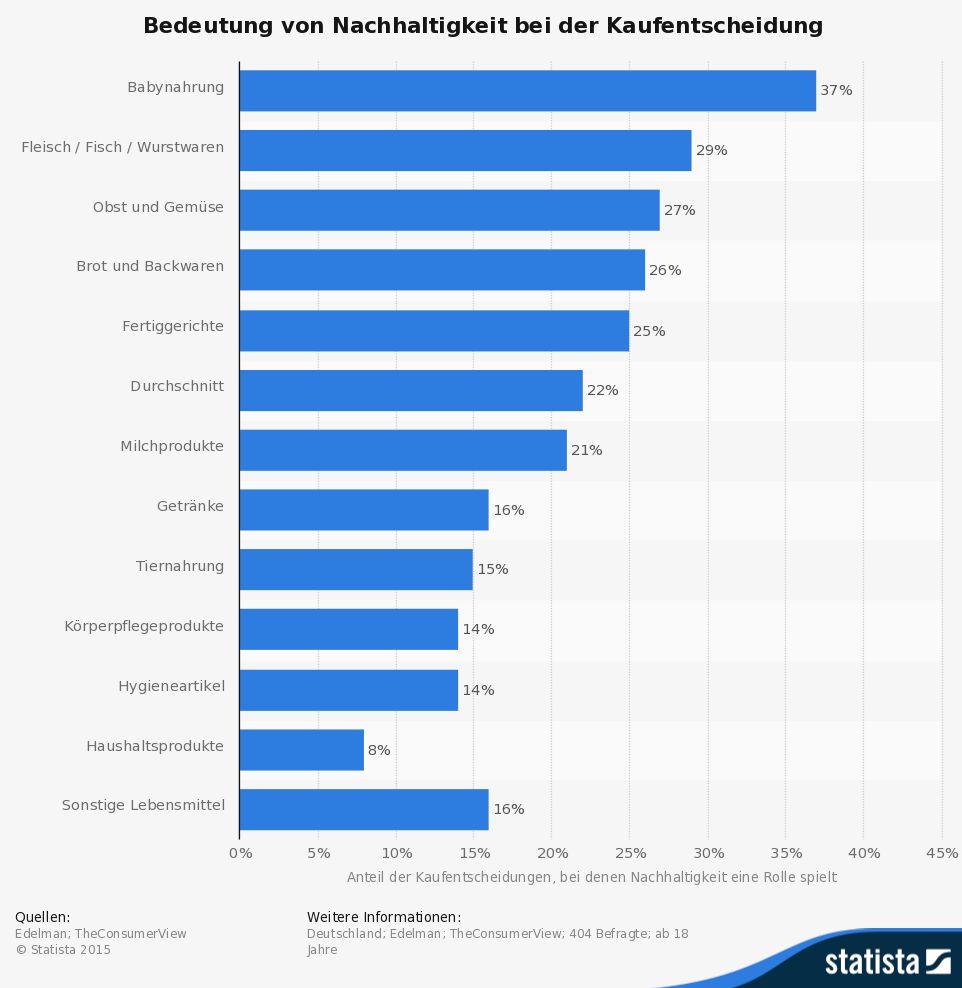 Warum bietet es sich überhaupt an, auf ein nachhaltiges Gartenhaus zu setzen? Zum einen lässt sich als Motivation anführen, dass man damit einem aktuellen Trend folgt, denn die Bundesbürger und ihre europäischen Nachbarn achten Studien zufolge zunehmend auf Umweltbewusstsein. Speziell die Kaufentscheidung der Deutschen wird laut Umfragen von der Nachhaltigkeit beeinflusst. So ist bei einer Befragung der Unternehmen TheConsumerView und Edelmann herausgekommen, dass vor allem bei Lebensmitteln hierauf geachtet wird (siehe Abbildung; Quelle: de.statista.com.