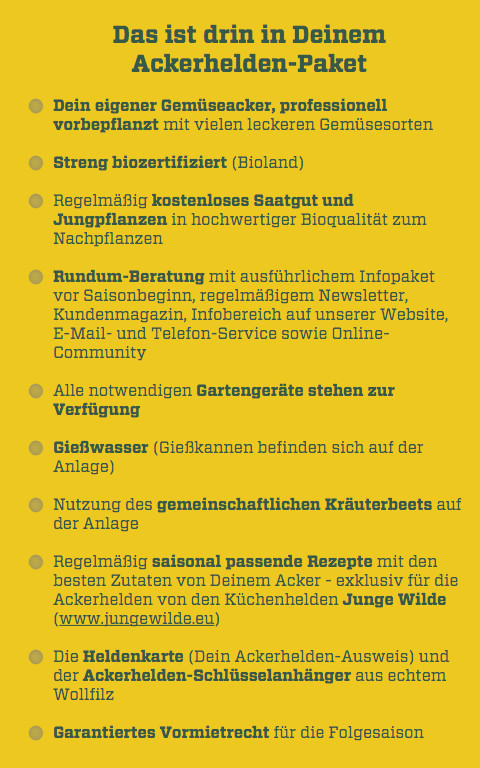 Das Bio-Gemüse wächst regional und saisonal. Einfach Natur pur. Durch eine intensive Beratung und Betreuung des Ackerhelden-Teams mit u.a. Newslettern, Mailings, Telefonberatung, einer Internetcommunity und einem Kundenmagazin werden innerhalb kürzester Zeit aus Gemüsebau-Anfängern echte Hobbylandwirte, Ackerhelden eben. Mit Düsseldorf entsteht bundesweit der neunte entweder Bioland, Demeter oder Naturland zertifizierte Ackerhelden Standort. Gestartet sind die Ackerhelden Initiatoren Birger Brock und Tobias Paulert 2013 mit Berlin, Bremerhaven und Mönchengladbach. Diese drei Standorte wurden für 2014 aufgrund der Nachfrage auf die doppelte Fläche vergrößert. Mittlerweile können aber auch an sechs weiteren Standorten - in Braunschweig, in Dorsten (Schermbeck), am Niederrhein (Kamp-Lintfort), in der Ohligser Heide (Solingen), in Wolfsburg und eben in Düsseldorf - die vorbepflanzten Ackerhelden Bio-Gemüseäcker auf der Webseite www.ackerhelden.de bestellt werden: 40 qm versorgen bis zu drei Personen und kosten 248,-€. 80 qm für bis zu sechs 445,-€.
