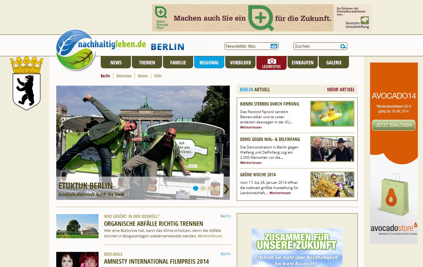 Mainz, 19.02.2014. Das bekannte Onlineportal für einen ökologischen Lebensstil, www.nachhaltigleben.de, informiert jetzt seine Leser auch auf regionaler Ebene. Seit Mitte Februar können Leser aus Berlin, Köln, Frankfurt, Mainz und München über den Regional-Schalter auf der Startseite von nachhaltigleben.de ihre eigene Region auswählen und spezifische, aktuelle Meldungen, Nachrichten und Informationen erhalten. So wissen die Besucher genau, was „daheim“ passiert und können sich sicher sein, dass zum Beispiel vorgestellte Veranstaltungen ohne Probleme zu erreichen sind und präsentierte Themen sie auch direkt betreffen. Das Ecolifestyle-Portal nachhaltigleben.de möchte mit der Regionalisierung der Seite eine noch engere Bindung zum Leser herstellen und sicher gehen, dass alle Besucher die Informationen erhalten, die sie am meisten interessieren. Für die nahe Zukunft plant nachhaltigleben.de, die Regionalseite noch um weitere Regionen in ganz Deutschland zu erweitern.