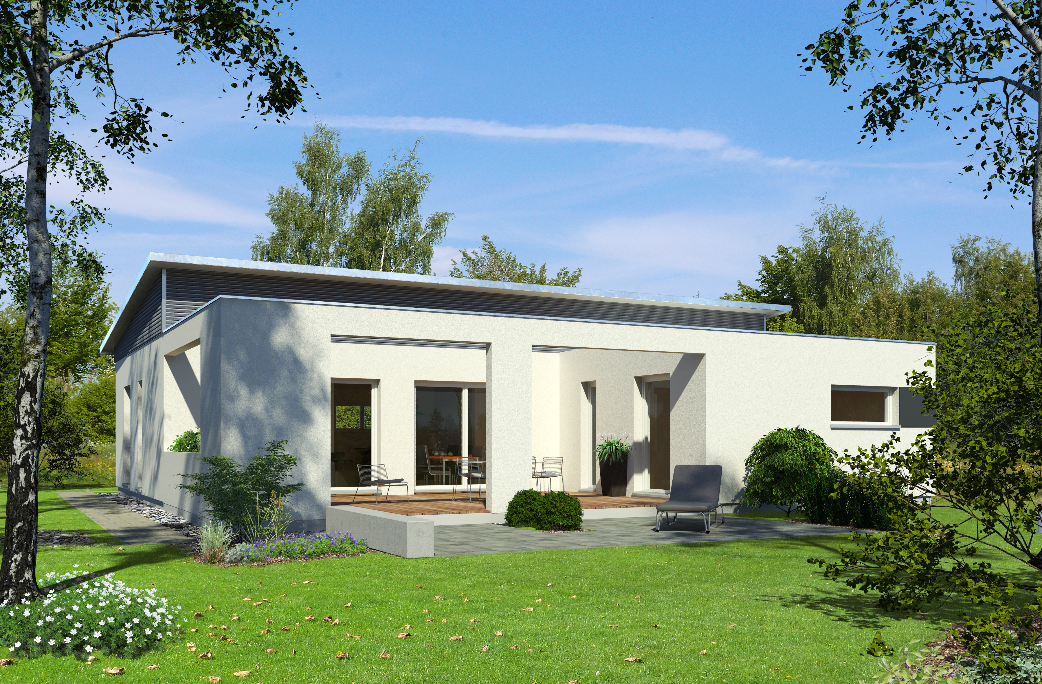 Klare Linien und keinerlei Kompromisse in Sachen Komfort – so präsentiert sich der neue Pultdach-Bungalow aus der PlanMit-Reihe vom Ökohaus-Pionier Baufritz.