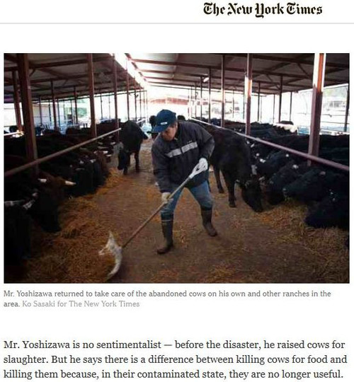 Yoshizawa beschloss zurück zu kehren und die streunenden Tiere einzusammeln. Jetzt füttert er über 300 Rinder in seinem Stall. „Sie haben“, zitiert ihn die NYT, „jetzt ein längeres Leben als sie es früher zu erwarten hatten.“