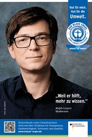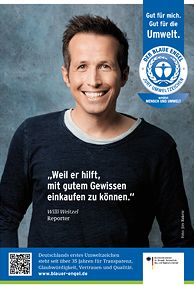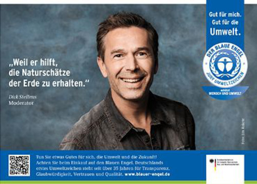 Die Umweltbotschafter bringen – in Szene gesetzt vom Berliner Fotografen Jim Rakete – in Form eines persönlichen Statements auf den Punkt, warum der Blaue Engel gut für sie und die Umwelt ist. Für Reporter Willi Weitzel ist der Blaue Engel wichtig, „Weil er hilft, mit gutem Gewissen einkaufen zu können.“ Moderator Ralph Caspers betont: „Wir brauchen auf Produkten verlässliche Informationen und keine bunte Augenwischerei“. Moderator Dirk Steffens appelliert: „Bei unseren Kaufentscheidungen dürfen wir nicht nur auf den Preis schauen, sondern müssen anfangen, auch auf den Wert eines Produktes zu achten.“ Der „Blaue Engel“ kennzeichnet besonders umweltfreundliche Produkte und bietet Orientierung für einen nachhaltigen Einkauf. Dafür gibt auch Florian Silbereisen gerne seine Stimme: „Die größte Herausforderung ist wahrscheinlich, die Menschen davon zu überzeugen, dass jeder etwas tun kann und dass wirklich jede Kleinigkeit hilft.“