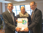 BU: Gelungener Auftakt! Britta Buhck, Vorstand der Buhck-Stiftung (Mitte), Dr. Christoph Mager, Landrat des Kreises Herzogtum Lauenburg (Rechts) und Ralf Thielebein, Geschäftsführer der S.O.F. Save Our Future – Umweltstiftung (Links), geben gemeinsam den Startschuss für die Bildungsinitiative KITA21 - Die Klimaretter.
