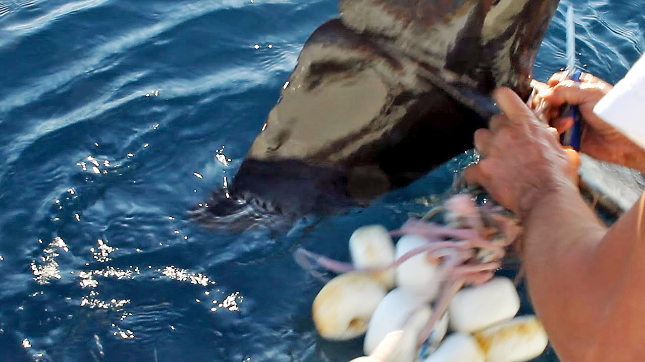 Das Tier hing mit der Fluke in einem Seil fest, an dem ein Kanister zur Markierung eines Fischernetzes befestigt war. Entschlossen griff der Mann ein und schnitt das Seil durch. Der Delfin war wieder frei, zog nun aber den Kanister hinter sich her – ein tödliches Verhängnis!
