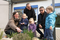 Die Kinder der KiTa Arte und Erzieherin Graciela Wilhelm zeigen Carsten Veller, FiBL (m.) und Thomas Graner, BfN (r.) ihre Kräuterspirale und ernten gemeinsam Schnittlauch für einen leckeren Kräuterquark. (Foto: Bildschön, Nicole Müller)