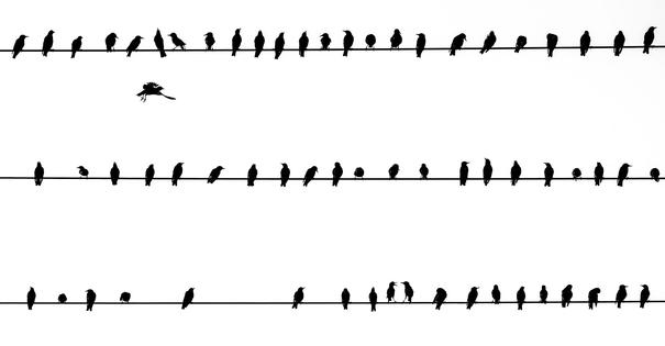 Gewinner des diesjährigen Wettbewerbs „GDT Naturfotograf des Jahres 2017“ ist der erst 20-jährige Dominik Janoschka aus einem kleinen Ort in Nordhessen. Zur Entstehung des Siegerbildes „Flattermänner“ berichtet er von einem Streifzug zu einer Kiesgrube, bei der er eigentlich Schmetterlinge fotografieren wollte: „Plötzlich brach, begleitet von einer unglaublichen Geräuschkulisse, ein Schwarm Stare über mich herein. Überall um mich herum saßen Vögel, zankten sich und riefen. Während ich meinen Blick über das Schauspiel streifen ließ, fielen mir die drei Stromleitungen auf, die in Reih und Glied mit Staren ausgeschmückt waren. Sobald sich etwas Bewegung ergab, löste ich aus.“ Das Ergebnis: eine eindrucksvolle Moment-Aufnahme in schwarz-weiß.