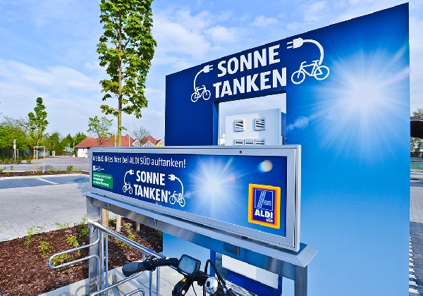 Auf den Dächern von mehr als 1200 ALDI SÜD-Filialen produzieren Fotovoltaikanlagen klimafreundlichen Solarstrom. Damit gewinnt der Discounter jährlich 112 Millionen Kilowattstunden Strom, der größtenteils vor Ort verbraucht wird.