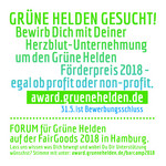 Grüne Helden Förderpreis loben Grüne Helden mit den Partnern FairGoods, EcoCrowd/Deutsche Umweltstiftung, Triodos Bank, Unternehmensgrün, Biohost, cloudsters, mein.woody uvm. aus.