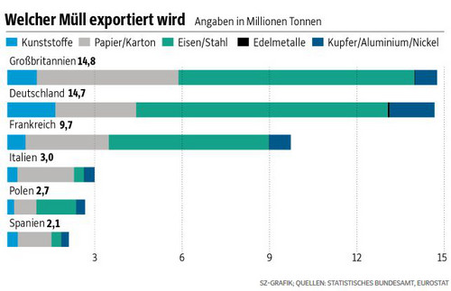 Wegen der guten Wirtschaftslage werden die Müllmengen in Europa eher noch zunehmen. Nach derzeitigem Stand lässt sich Plastikabfall nur zum Teil sortieren und wiederverwerten und findet dann nur schwer Abnehmer, da Rohgranulat günstiger ist ("Süddeutsche").