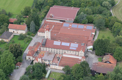 Die Vogelperspektive zeigt die Solaranlage auf dem Dach und links unten den Kanal des Wasserkraftwerks.