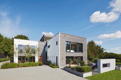 Das große Einfamilienhaus besticht durch seine drei verschiedene Fassadenarten – naturbelassene Holzverschalung „Rondo“, weißer Mineralputz und graue Fassadenplatten. Während der L-förmige Baukörper auf der Süd-Seite offen zur Natur gestaltet wurde, verschließt er sich nach Norden fast komplett. Nur einzelne kleine Fenster lockern die Fassade bei der Nord- und Westseite auf. Die großen bodentiefen Fenster auf der Ost- und Süd-Seite lassen viel Licht ins Innere der Räume strömen. Die Süd-Terrasse mit direktem Zugang zum Wohnbereich bietet viel Raum zum Entspannen und verlagert, wenn gewünscht, den Wohnraum nach draußen. Zudem schützt ein Beton-Sichtschutz die Bewohner vor neugierigen Blicken.