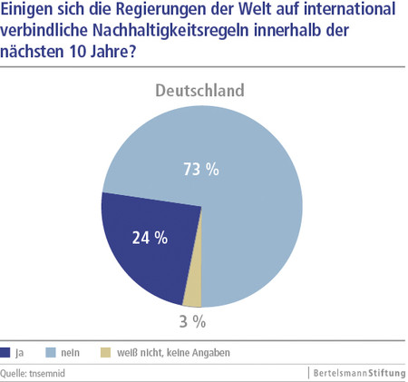 Ihre Zukunft sehen die Bürger laut der Umfrage jedoch eher skeptisch. 73 Prozent der Deutschen glauben, dass es den Regierungen der Welt nicht gelingt, sich innerhalb der nächsten zehn Jahre gemeinsam darüber zu einigen, wie die Finanzmärkte im Zaum gehalten, die ungehemmte Nutzung von natürlichen Ressourcen einschränkt und der weitere Anstieg von CO2-Emissionen gestoppt werden können.