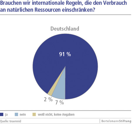 Das gleiche Vorgehen halten sie auch bei der Begrenzung des Ausstoßes klimaschädlicher Gase und dem Verbrauch natürlicher Ressourcen für notwendig. Das zeige eine repräsentative Umfrage von TNS-Emnid im Auftrag der Bertelsmann Stiftung.
