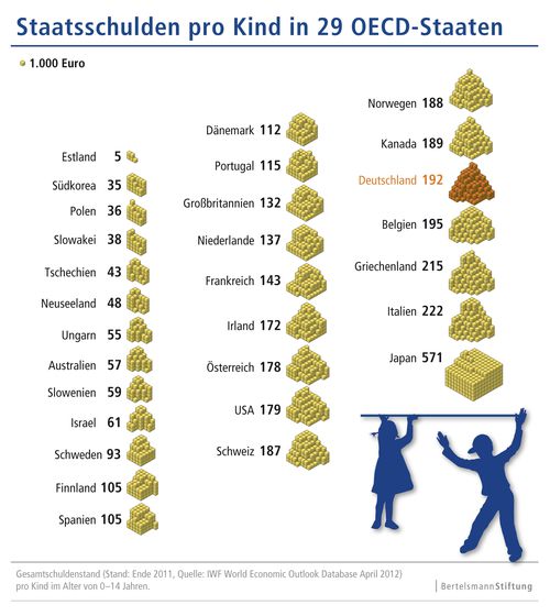„Auch Deutschland schneidet in dieser Vergleichsbetrachtung nur mittelmäßig ab“, fasst die Gütersloher Stiftung das Ergebnis der Untersuchung zusammen. Während beispielsweise in Estland auf jedes Kind unter 15 Jahren nur 4.600 Euro Staatsschulden entfallen, müsste jedes deutsche Kind bereits heute rund 192.000 Euro an öffentlichen Verpflichtungen schultern. „Das sind im Vergleich nur etwas weniger als im hochverschuldeten Griechenland mit rund 215.000 Euro oder Italien mit 222.000 Euro öffentlichen Schulden pro Kind“, schreibt die Bertelsmann Stiftung über das Ergebnis der Untersuchung.