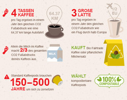 Kaffee ist auch ein wichtiges Thema. Zum Beispiel macht es einen großen Unterschied, ob man seinen Kaffee schwarz oder mit Milch trinkt. Mit 4 Tassen schwarzem Kaffee pro Tag erzeugt man übers Jahr verteilt den gleichen CO2-Ausstoß wie bei einer 64,37 km langen Fahrt mit einem durchschnittlichen Auto, mit 3 Latte Macchiato sogar so viel wie bei einem Flug durch halb Europa. Steigen Sie auf Bio- Fairtrade Kaffee um. Kompostierbare Kaffeepods sind eine gute Alternative zu denen aus Aluminium, die zwischen 150 bis 500 Jahren benötigen, um sich vollständig abzubauen.