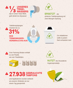 Über die Toilettenspülung wird etwa ein Drittel unseres Trinkwassers von der Wasserleitung direkt in den Abwasserkanal gespült. Eine Zwei-Mengen-Spültechnik verbraucht im Vergleich zu einer normalen Spülung nur rund 67% Wasser. Das spart auch Kosten für Wasser.