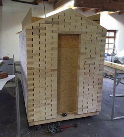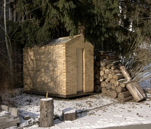 Alles Gründe weshalb der Architekt des Hühnerhauses, Max Otto Zitzelsberger auf Holz gesetzt hat. Die ungewöhnliche Bauweise aus „Holz-Ziegeln“, die von weitem wie „unverputztes Mauerwerk“ aussehen, zeigt wie individuell der Baustoff Holz verwendet werden kann. „Die Holzklötzchen sind einheitlich 10 Zentimeter breit, 5 Zentimeter hoch, 21,5 Zentimeter lang und werden im Längsverband im Abstand von einem Zentimeter verlegt. Somit ist für ausreichend Durchlüftung und Licht im Stall gesorgt“, erklärt der Architekt und Bauherr Zitzelsberger, der am Lehrstuhl für Entwerfen und Holzbau der TU München arbeitet.