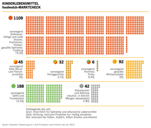 foodwatch hat zwischen April 2011 und Januar 2012 insgesamt 1.514 Produkte, die als spezielle Kinderlebensmittel ausgewiesen sind, gesammelt und überprüft. Die Produkte richten sich mit Hilfe von Bezeichnungen wie „für Kids“, mit Comic-Figuren wie „Biene Maja“ oder „Wicki“, Spielzeug-Beigaben oder Aktionen (Online-Spiele, Tipps für Schulreferate) gezielt an Kinder.