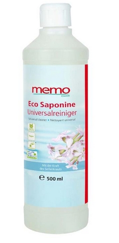 Das memo Vollwaschmittel „Eco Saponine“ aus Seifenkraut kommt ohne Duft- und Farbstoffe sowie ohne chemische Zusätze (z.B. Phosphate, Enzyme, optische Aufheller) aus. Die darin enthaltene natürliche Milchsäure reduziert Kalkablagerungen und spart den Enthärter für die Waschmaschine.