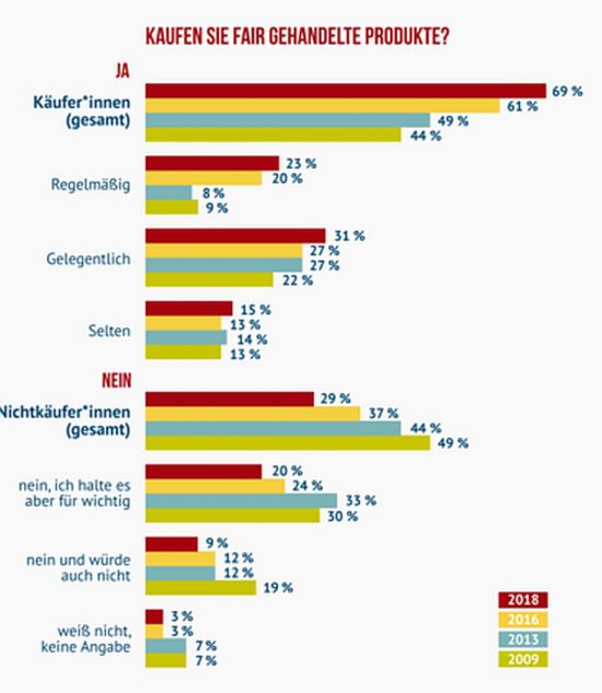In Zahlen: Zwei Drittel der Befragten gab an, fair gehandelte Produkte zu kaufen. Der Anteil der Käuferinnen und Käufer in der Bevölkerung sei, so die Organisation, zwischen 2009 (44,1 Prozent) und 2018 (68,7 Prozent) somit um gut die Hälfte gestiegen.