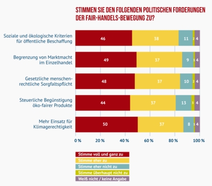 Die politischen Forderungen des Verbands genießen unter den Befragten laut Umfrageergebnis ein ausgesprochen hohes Maß an Zustimmung. Am wichtigsten sei den Menschen die Forderung nach mehr Klimagerechtigkeit. Der Aussage „Die Hauptverursacher des Klimawandels müssen für mehr Klimagerechtigkeit die sogenannten Enwicklungsländer bei der Anpassung an die Folgen des Klimawandels unerstützen“ stimmten insgesamt 87 Prozent zu.